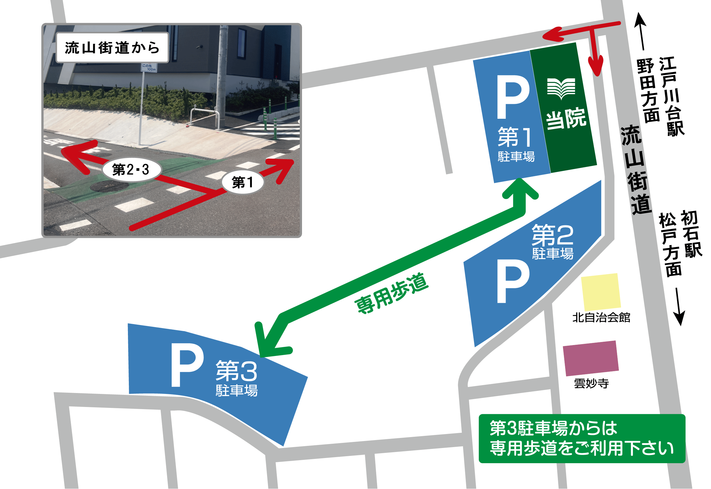 「江戸川台駅西口」より「流山街道方面」に約3分程進んでいただき、「江戸川台駅入口交差点」を左に曲がります。約2分進んでいただくと右手に当院が見えてきます。