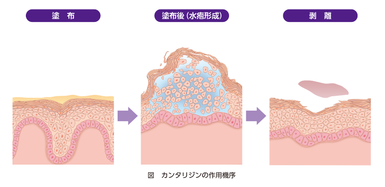 ワイキャンス(一般名:カンタリジン)は皮膚の表皮の浅い層に作用し、ウイルスに感染した細胞を皮膚表面から浮かせます。